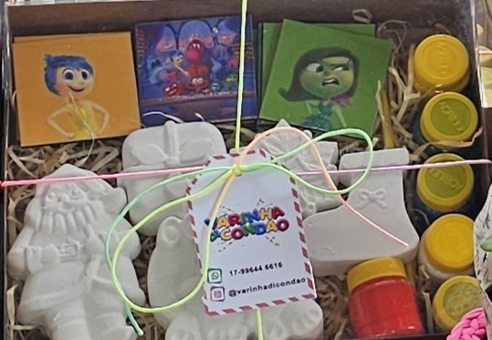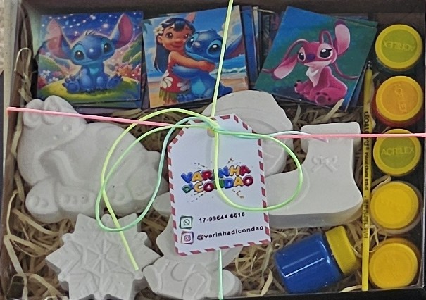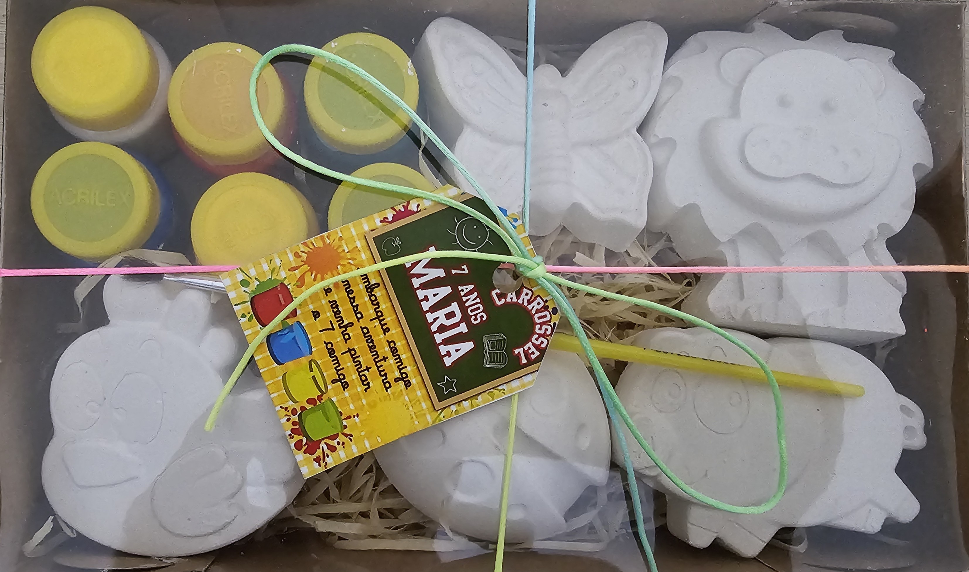 Cada kit contém peças de gesso temáticas, um conjunto de tintas coloridas, um pincel.Alguns Kits temáticos podem vir outros materiais descritos em cada Kit na hora da compra.Tudo pronto para começar a pintar!